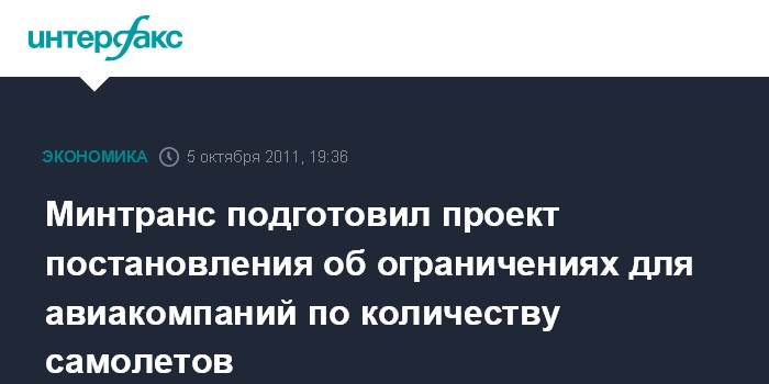 Москва. 5 октября. INTERFAX.RU - Минтранс РФ подготовил проект постановления правительства об ограничениях для авиакомпаний по количеству воздушных судов, говорится в сообщении ведомства.