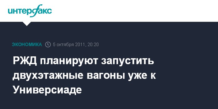 Москва. 5 октября. INTERFAX.RU - ОАО "Российские железные дороги" (РЖД) планирует запустить в дальнем сообщении двухэтажные пассажирские вагоны не к Олимпиаде 2014 г. на Северо-Кавказской желдороге, а в 2013 г. на Горьковской ЖД (ГЖД), заявляют организаторы предстоящего нижегородского форума "Россия единая", со ссылкой на неназванного представителя ГЖД.