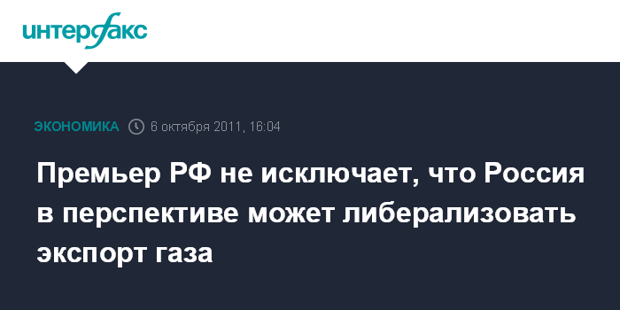 Москва. 6 октября. INTERFAX.RU - Россия в перспективе может либерализовать экспорт газа, заявил премьер-министр РФ Владимир Путин на конференции VTB Capital "Россия зовет"