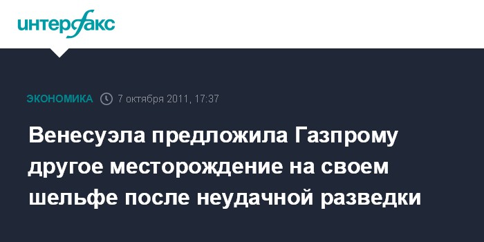 Москва. 7 октября. INTERFAX.RU - Венесуэла предложила "Газпрому" новый проект на шельфе после того как разведка на первом участке "Газпрома" Urumaco 1 не принесли результатов.