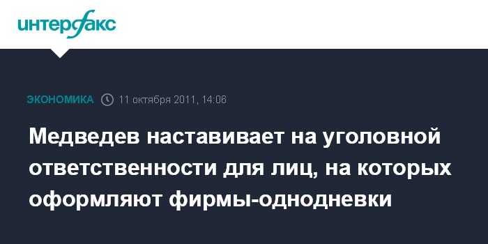 Москва. 11 октября. INTERFAX.RU - Президент РФ Дмитрий Медведев предлагает ввести уголовную ответственность для лиц, которые предоставляют свои документы для создания фирм-однодневок.