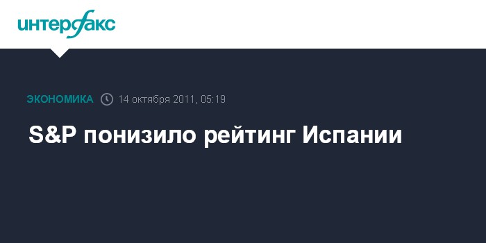 Лондон. 14 октября. INTERFAX.RU - Международное рейтинговое агентство Standard & Poor's понизило долгосрочный кредитный рейтинг Испании на один пункт - с АА до АА- с негативным прогнозом, сообщает британская телерадиовещательная корпорация Би-би-си.