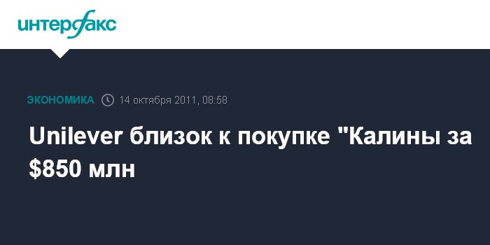 Москва. 14 октября. INTERFAX.RU - Англо-голландская компания Unilever PLC близка к заключению сделки по покупке примерно за $850 млн российского ОАО "Концерн "Калина", сообщает The Wall Street Journal со ссылкой на информированные источники.