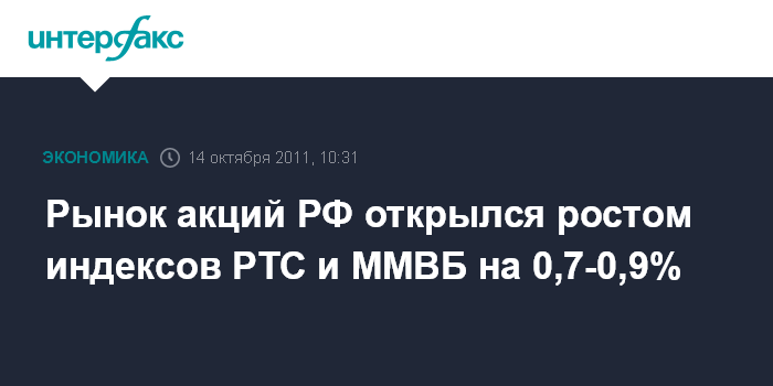 Москва. 14 октября. INTERFAX.RU - Российский рынок акций открылся в пятницу ростом цен blue chips на фоне позитивной динамики фьючерсов на индексы в США после выхода сильного отчета Google; индексы РТС и ММВБ за минуту торгов выросли на 0,7-0,9%.