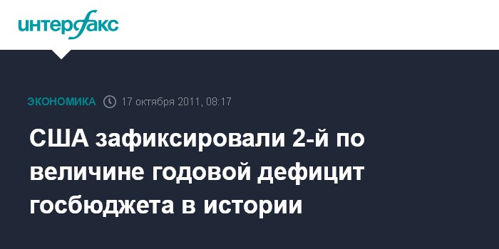 Вашингтон. 17 октября. INTERFAX.RU - США завершили 2011 финансовый год с бюджетным дефицитом в $1,299 трлн, или 8,7% ВВП, по сравнению с $1,294 трлн, или 8,9% ВВП, в предыдущем году, сообщило американское министерство финансов.