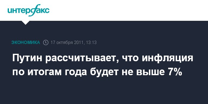 Москва. 17 октября. INTERFAX.RU - Инфляция в России по итогам года, как ожидается, не превысит 7%, на сегодняшний день накопленная инфляция составляет 4,7%, сообщил премьер РФ Владимир Путин, выступая в понедельник на заседании Консультативного совета по иностранным инвестициям.
