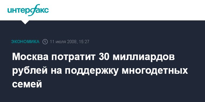 Москва. 11 июля. INTERFAX.RU - Программа поддержки многодетных семей обходится столице в 30 млрд рублей, заявила руководитель департамента семейной и молодежной политики Москвы Людмила Гусева в пятницу на конференции "Многодетная семья в современной России".