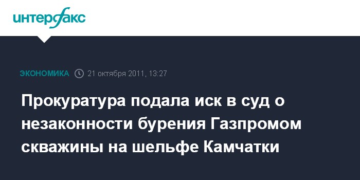 Владивосток. 21 октября. INTERFAX.RU - Камчатская межрайонная природоохранная прокуратура пытается через суд признать незаконным бурение "Газпромом" и его подрядчиками поисковой скважины на Первоочередной структуре Западно-Камчатского участка шельфа Охотского моря.