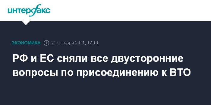 Брюссель. 21 октября. INTERFAX.RU - Россия и ЕС сняли все двусторонние вопросы в рамках переговорного процесса по присоединению России к ВТО.