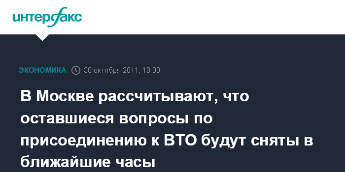 В Москве рассчитывают, что оставшиеся вопросы по присоединению к ВТО будут сняты в ближайшие часы
