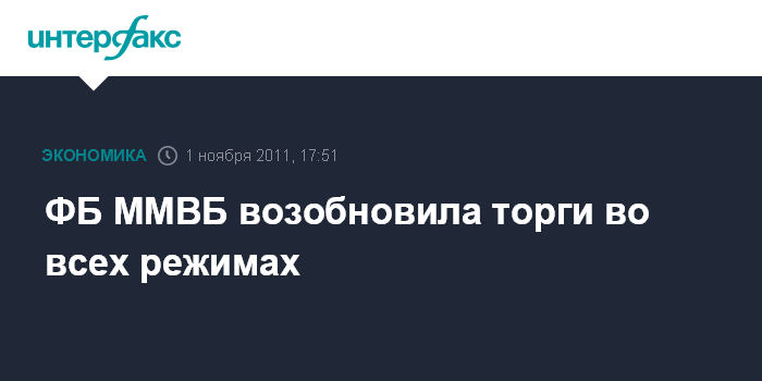Москва. 1 ноября. INTERFAX.RU - Фондовая биржа ММВБ возобновила торги по всех режимах, говорится в сообщении биржи, размещенном на ее сайте.