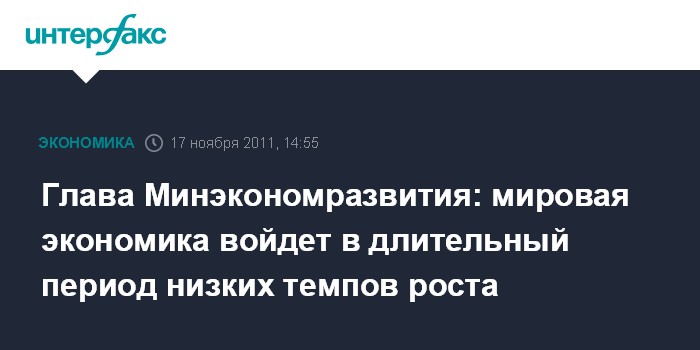 Москва. 17 ноября. INTERFAX.RU - Мировая экономика войдет в длительный период низких темпов роста, что будет оказывать существенное влияние на развитие России, заявила в интервью "Интерфаксу" глава Минэкономразвития Эльвира Набиуллина.