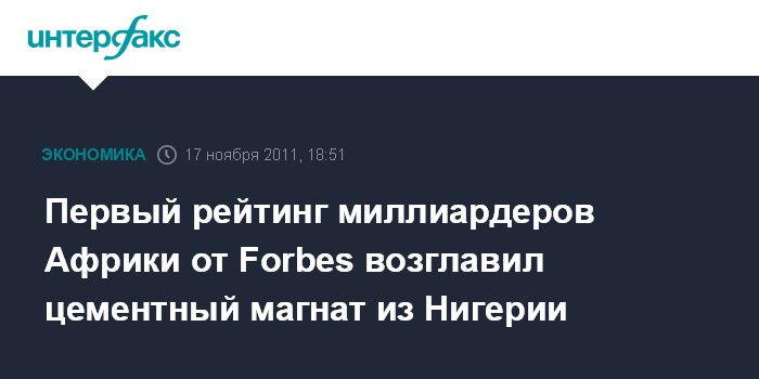 Москва. 17 ноября. INTERFAX.RU - Журнал Forbes опубликовал свой первый рейтинг самых богатых африканцев, сообщает BBC.