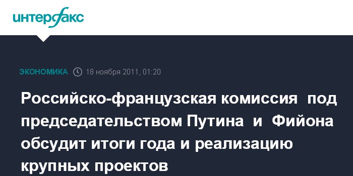 Российско-французская комиссия под председательством Путина и Фийона обсудит итоги года и реализацию крупных проектов