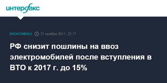 Москва. 21 ноября. INTERFAX.RU - Россия после вступления в ВТО снизит ввозные пошлины на новые легковые автомобили, приводимые в движение электродвигателями, к 2017 году до 15% с 20% в настоящее время.