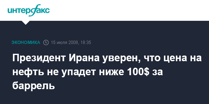 Тегеран. 15 июля. INTERFAX.RU - Президент Ирана Махмуд Ахмадинежад считает, что цена на нефть не опустится ниже $100 за баррель из-за политического напряжения в Персидском заливе.