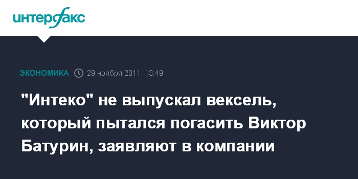 "Факт того, что все расчеты с Батуриным были произведены компанией "Интеко" в соответствии с законом при его увольнении в 2005 году, был уже установлен судом в 2007 году при рассмотрении иска Батурина с требованием о его восстановлении на работе, а также был подтвержден судом повторно в 2011 году. Вексель, который В.Н. Батурин пытался предъявить к погашению, никогда компанией "Интеко" не выпускался", - сказали в пресс-службе.