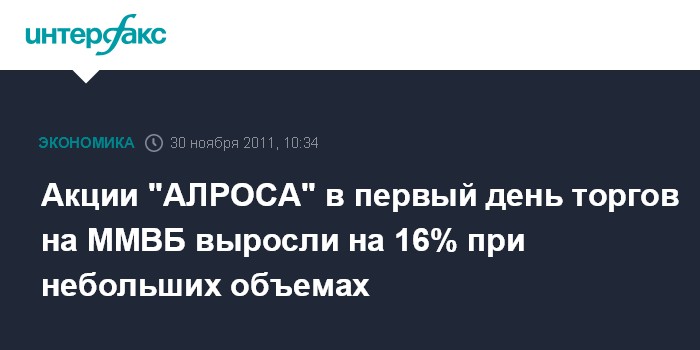 Москва. 30 ноября. INTERFAX.RU - Акции ОАО "АК "АЛРОСА" в первый день торгов в перечне внесписочных ценных бумаг на ММВБ выросли на 16% при небольших объемах торгов.