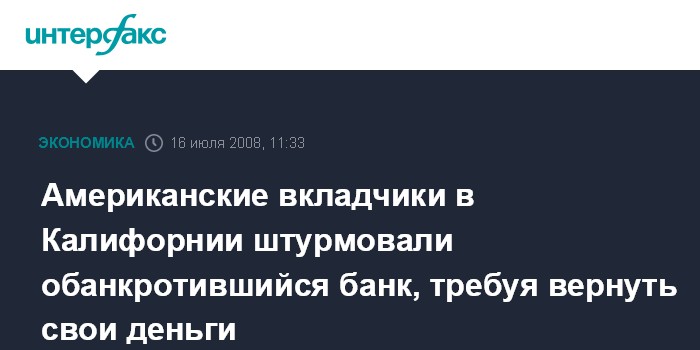 Сотни клиентов IndyMac, имеющие вклады в этом банке почти на $20 млрд, выстроились перед калифорнийскими офисами, чтобы снять максимально возможную сумму. Кто-то занял место в очереди за 5 часов до открытия банка, крушение которого стало крупнейшим в США за 28 лет.