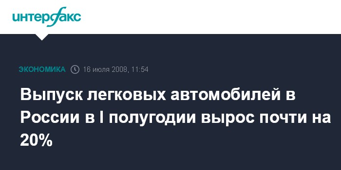 Москва. 16 июля. INTERFAX.RU - Производство легковых автомобилей в РФ в I полугодии выросло на 19,1% по сравнению с аналогичным периодом прошлого года - до 724 тыс. штук, свидетельствуют данные Федеральной службы государственной статистики (Росстат).