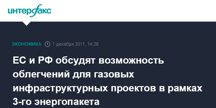 Москва. 1 декабря. INTERFAX.RU - Еврокомиссия и Россия договорились в начале года обсудить возможность облегчений для газовых инфраструктурных проектов в рамках Третьего энергопакета ЕС, сообщил журналистам еврокомиссар по энергетике Гюнтер Эттингер.