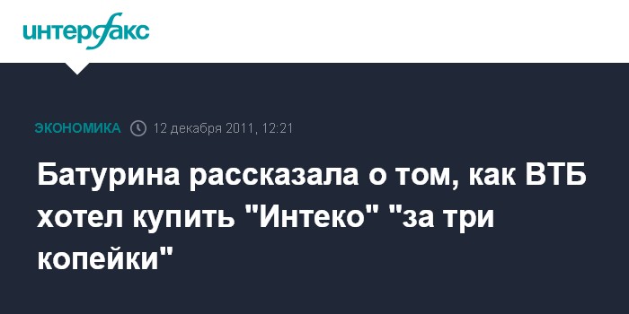 12 декабря. INTERFAX.RU - Глава ВТБ Андрей Костин хотел приобрести "Интеко" за "три копейки", рассказала экс-глава "Интеко", жена бывшего мэра Москвы Юрия Лужкова Елена Батурина.