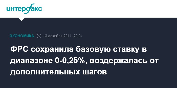 Вашингтон. 13 декабря. INTERFAX.RU - Федеральная резервная система (ФРС) США по итогам однодневного заседания, прошедшего во вторник, приняла решение о сохранении целевого диапазона базовой процентной ставки от нуля до 0,25% годовых, говорится в документе по итогам декабрьского заседания Федерального комитета по открытым рынкам (FOMC).