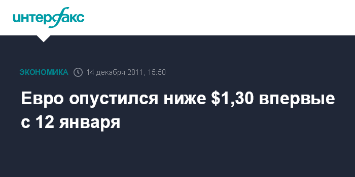 Лондон. 14 декабря. INTERFAX.RU - Курс евро к доллару в среду пробил уровень $1,30 вниз впервые с 12 января 2011 года после того, как выросла стоимость привлечения заемных средств для Италии, сообщает агентство Bloomberg.
