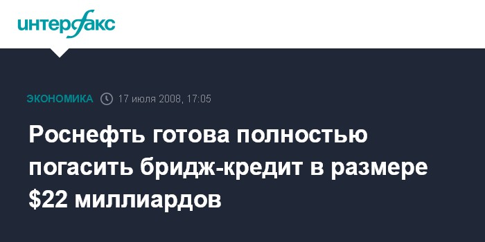 Москва. 17 июля. INTERFAX.RU - Компания "Роснефть" завершила подготовку к погашению последнего транша бридж-кредита в размере $22 млрд, привлеченного в 2007 г. для финансирования приобретения российских добывающих, перерабатывающих, сбытовых и сервисных активов, говорится в пресс-релизе компании.