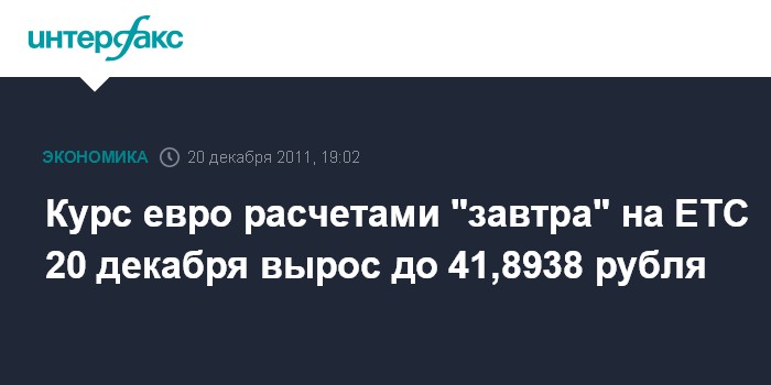 Курс евро расчетами "завтра" на ЕТС 20 декабря вырос до 41,8938 рубля