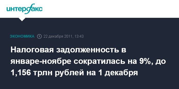 Налоговая задолженность в январе-ноябре сократилась на 9%, до 1,156 трлн рублей на 1 декабря