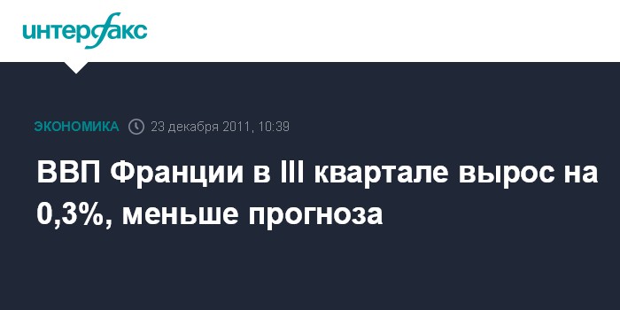Париж. 23 декабря. INTERFAX.RU - ВВП Франции в третьем квартале 2011 года вырос на 0,3% по сравнению с предыдущими тремя месяцами, свидетельствуют окончательные данные Национального статистического управления Insee.