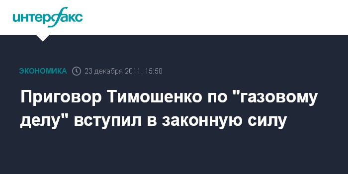 Киев. 23 декабря. INTERFAX.RU - После оглашения решения Апелляционного суда Киева, который оставил силе приговор Печерского районного суда Киева по "газовому делу" экс-премьера Юлии Тимошенко, решение вступает в силу, заявила гособвинитель Лилия Фролова.