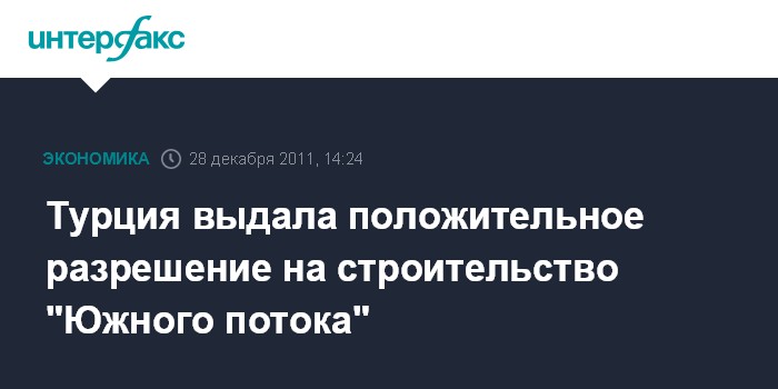 Москва. 28 декабря. INTERFAX.RU - Турция выдала положительное разрешение на строительство "Южного потока", заявил премьер-министр РФ Владимир Путин в ходе российско-турецких переговоров.