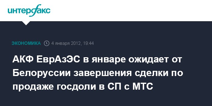 Минск. 4 января. ИНТЕРФАКС-ЗАПАД - Белоруссия планирует завершить сделку по продаже госдоли (51%) в белорусско- российском СООО "МТС" до конца января 2012 года.