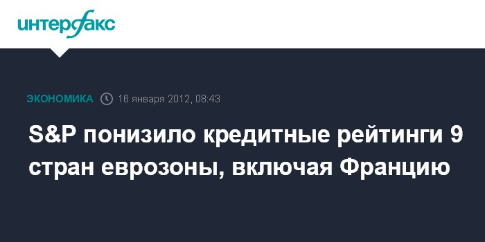 Лондон. 16 января. INTERFAX.RU - Международное рейтинговое агентство Standard & Poor's, указав на растущий системный риск в регионе, понизило долгосрочные кредитные рейтинги девяти стран еврозоны, лишив Францию и Австрию наивысшей кредитной оценки на уровне "ААА".