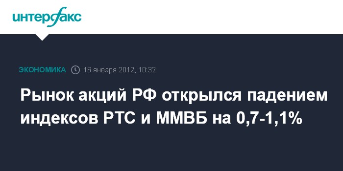 Москва. 16 января. INTERFAX.RU - Рынок акций РФ открылся в понедельник снижением цен blue chips на фоне ухудшения внешней фондовой конъюнктуры из-за понижения агентством S&P рейтингов ряда стран еврозоны, в том числе Франции; индексы РТС и ММВБ за минуту торгов просели на 0,7-1,1%.