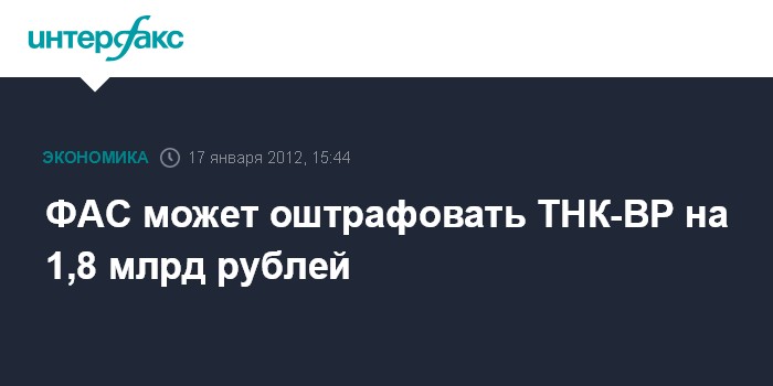 Москва. 17 января. INTERFAX.RU - Штраф для ТНК-BPв рамках "третьей волны" антимонопольных дел может составить 1,8 млрд рублей, сообщил журналистам глава Федеральной антимонопольной службы (ФАС) РФ Игорь Артемьев.