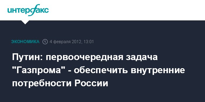 Москва.4 февраля. INTERFAX.RU - Премьер-министр РФ Владимир Путин поставил перед "Газпромом" задачу обеспечить необходимые поставки газа в Европу.