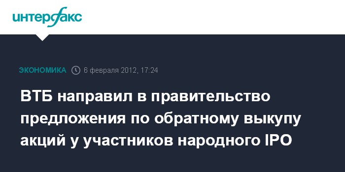 Москва. 6 февраля. INTERFAX.RU - ВТБ направил в правительство РФ свои предложения по обратному выкупу акций у миноритариев - участников "народного" IPO, сообщили агентству "Интерфакс-АФИ" в банке.
