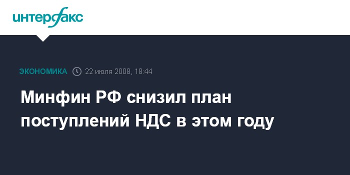 Москва. 22 июля. INTERFAX.RU – Минфин РФ в июле снизил прогноз поступлений по налогу на добавленную стоимость (НДС) в 2008 г. до 1 трлн 214,5 млрд рублей, сообщил агентству "Интерфакс-АФИ" источник в министерстве.