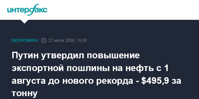 Москва. 22 июля. ИНТЕРФАКС-АФИ - Экспортная пошлина на нефть с 1 августа 2008 года вновь побьет рекорд и составит $495,9 за тонну.