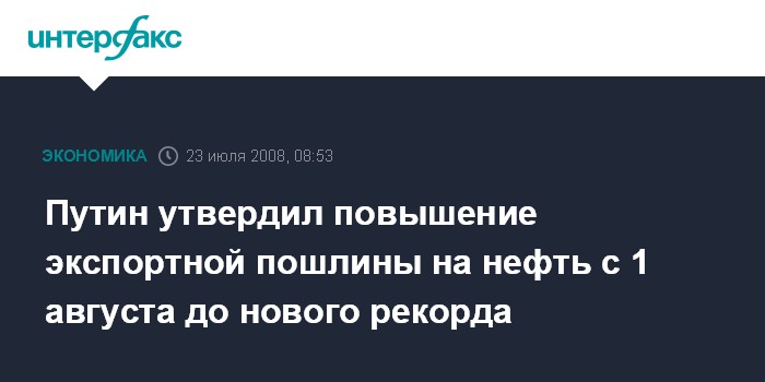 Москва. 23 июля. INTERFAX.RU - Экспортная пошлина на нефть с 1 августа 2008 года вновь побьет рекорд и составит $495,9 за тонну.
