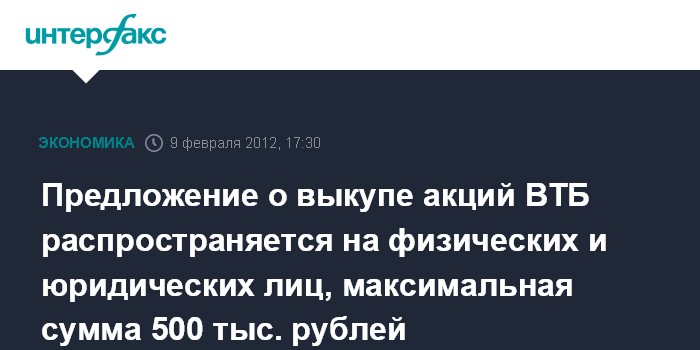 Предложение о выкупе акций ВТБ распространяется на физических и юридических лиц, максимальная сумма 500 тыс. рублей