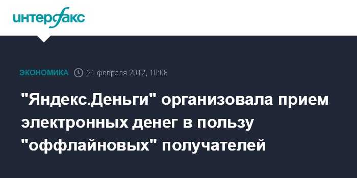 Москва. 21 февраля. INTERFAX.RU - Платежная система "Яндекс.Деньги" организовала прием электронных денег в пользу "оффлайновых" получателей платежей (организации, не работающие с системами электронных денег), следует из сообщения "Яндекс.Денег".