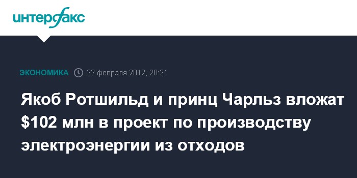 Лондон. 22 февраля. INTERFAX.RU - Консорциум инвесторов, среди которых известный британский финансист Якоб Ротшильд и принц Чарльз, наследник британского престола, вложит 65 млн фунтов ($102 млн) в создание компании, которая будет специализироваться на производстве электроэнергии из отходов (так называемые технологии "энергия из мусора", waste-to-energy), сообщило агентство Bloomberg.