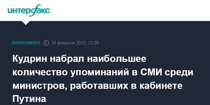 Москва. 24 февраля. INTERFAX.RU - Алексей Кудрин набрал наибольшее количество упоминаний в СМИ среди министров, работавших в кабинете премьера РФ Владимира Путина, второе место в рейтинге упоминаемости занял министр иностранных дел Сергей Лавров.