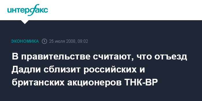 Москва. 25 июля. INTERFAX.RU - Тот факт, что Роберт Дадли покинул Россию, может свидетельствовать о сближении российских и британских акционеров компании ТНК-ВР, считает высокопоставленный источник в правительстве РФ.