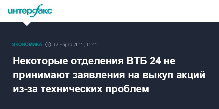 Москва. 12 марта. INTERFAX.RU - Некоторые отделения банка ВТБ 24 не принимают заявления на buyback акций ВТБ из-за технических проблем.