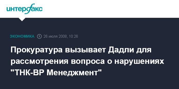 Москва. 26 июля. INTERFAX.RU - Прокуратура Центрального административного округа Москвы направила председателю правления ОАО "ТНК-ВР менеджмент" Роберту Дадли уведомление, что вызывает его в понедельник, 28 июля, для рассмотрения вопроса об административных нарушениях в "ТНК-ВР Менеджмент", говорится в письме прокурора Владимира Кутового к Р.Дадли, копией которого располагает Агентство нефтяной информации.